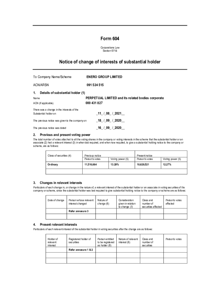 Form 604 Corporations Law Section 671BNotice of change of interests of substantial holder To Company Name/SchemeENERO GROUP LIMITED ACN/ARSN091 524 5151. Details of substantial holder (1) PERPETUAL