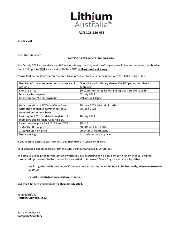 ACN 126 129 413 2 June 2021Dear Option holder, NOTICE OF EXPIRY OF TITO OPTIONS The 04 July 2021 expiry date for TITO options is approaching and the Company would like to remind option holders that