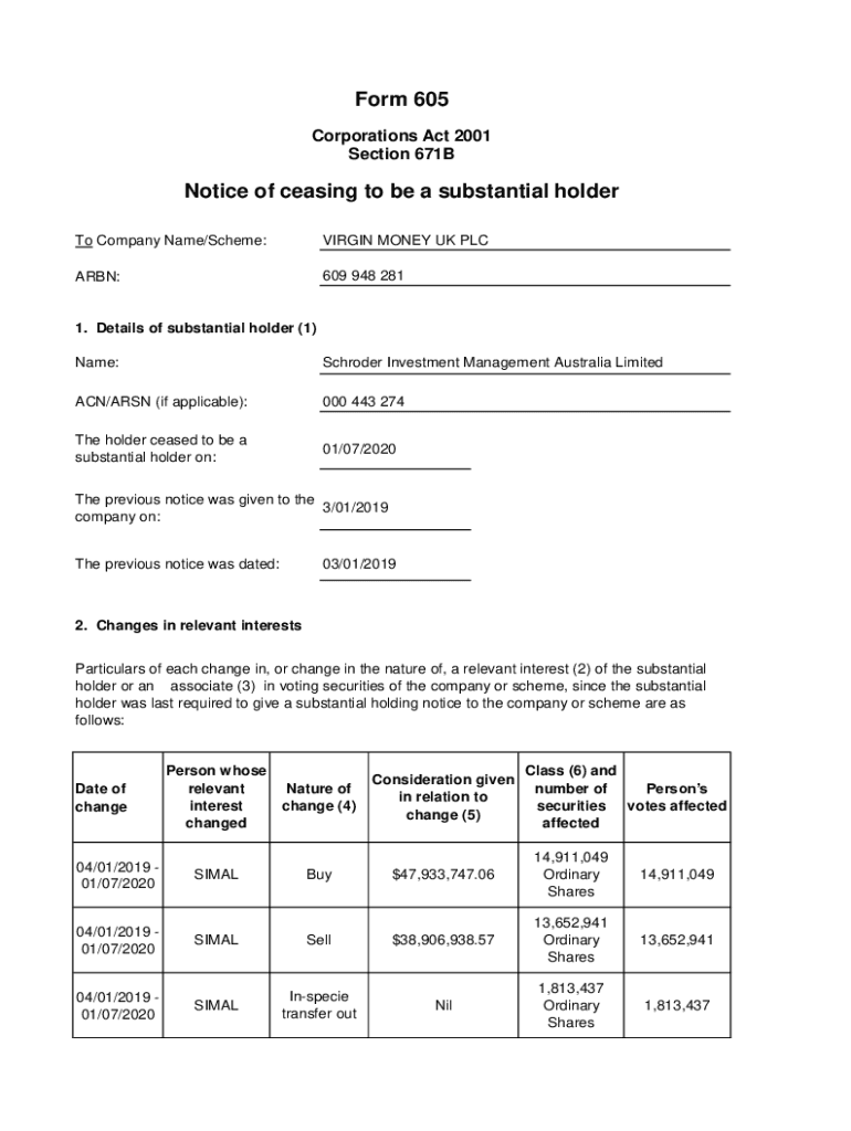 Form 605 Corporations Act 2001 Section 671BNotice of ceasing to be a substantial holder To Company Name/Scheme:VIRGIN MONEY UK PLAN:609 948 2811. Details of substantial holder (1) Name:Schröder Investment