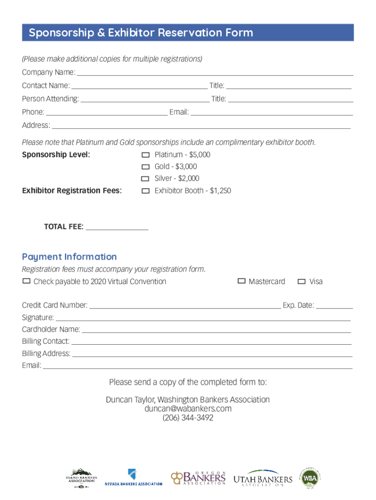 Sponsorship Options The Idaho, Nevada, Oregon, Utah and Washington Bankers Association are pleased to bring you our 2020 Virtual Convention. Sponsorship information is available at the levels outlined