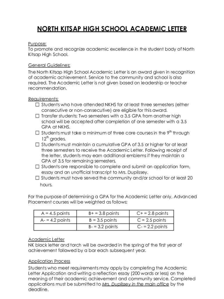 NORTH KIT SAP HIGH SCHOOL ACADEMIC LETTER Purpose: To promote and recognize academic excellence in the student body of North Kit sap High School. General Guidelines: The North Kit sap High School