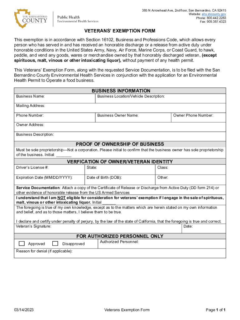 385 N Arrowhead Ave, 2nd floor, San Bernardino, CA 92415 Website: EHS.county.gov Phone: 800.442.2283 Fax: 909.387.4323VETERANS EXEMPTION FORM This exemption is in accordance with Section 16102, Business