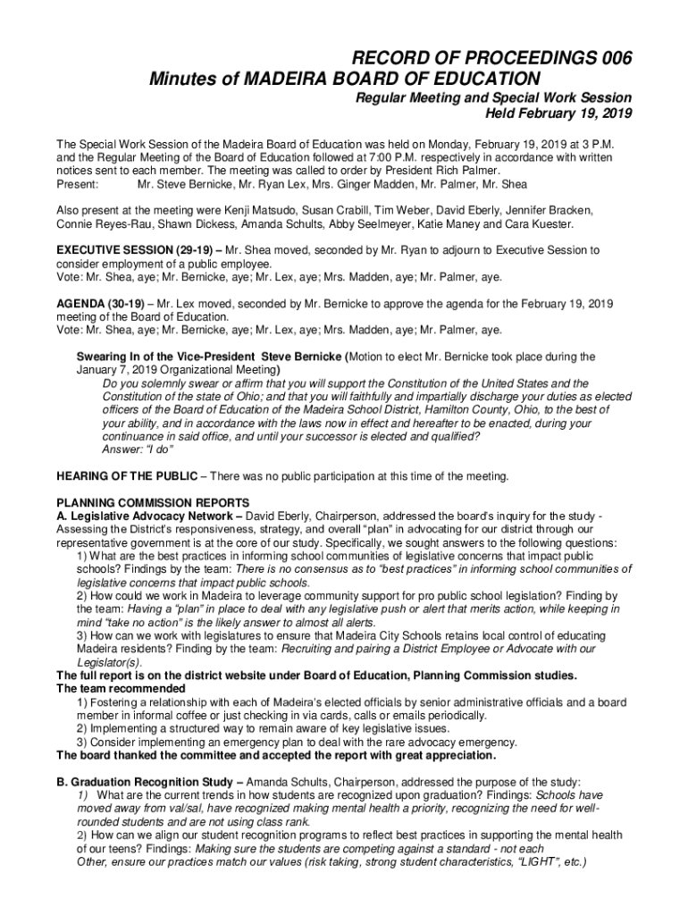 RECORD OF PROCEEDINGS 006 Minutes of MADEIRA BOARD OF EDUCATION Regular Meeting and Special Work Session Held February 19, 2019, The Special Work Session of the Madeira Board of Education was held