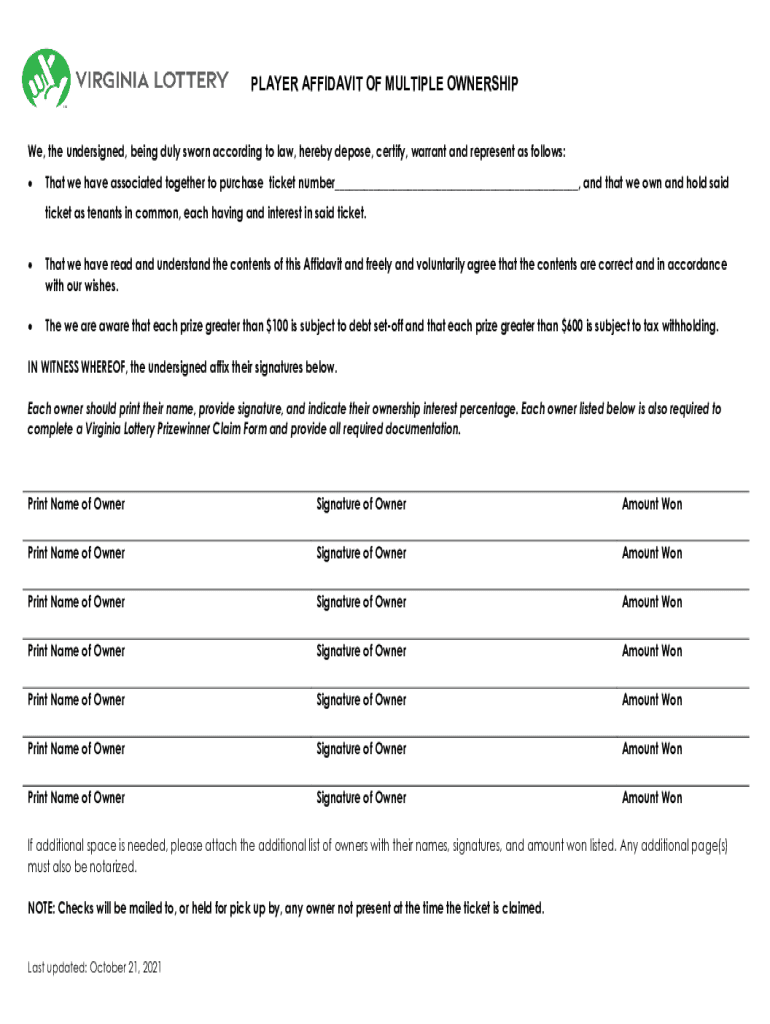 PLAYER AFFIDAVIT OF MULTIPLE OWNERSHIP We, the undersigned, being duly sworn according to law, hereby depose, certify, warrant and represent as follows: That we have associated to purchase ticket