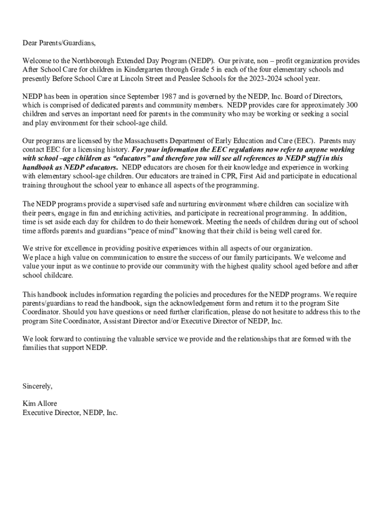 Dear Parents/Guardians, Welcome to the North borough Extended Day Program (NEP). Our private, non-profit organization provides After School Care for children in Kindergarten through Grade 5 in each