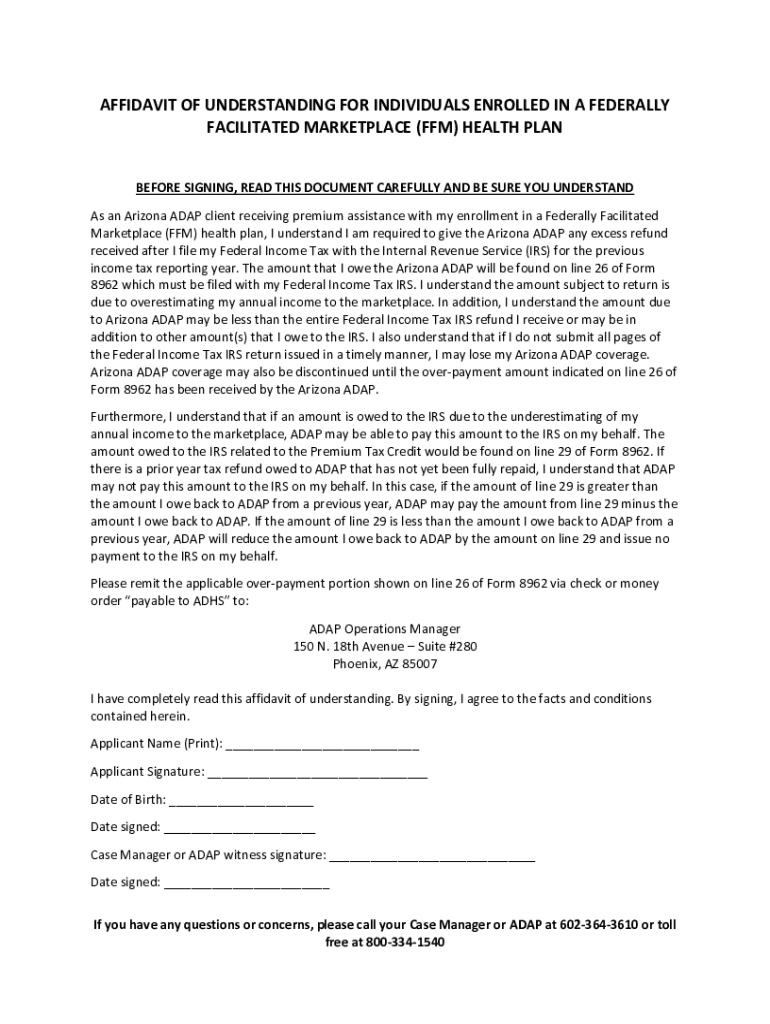 AFFIDAVIT OF UNDERSTANDING FOR INDIVIDUALS ENROLLED IN A FEDERALLY FACILITATED MARKETPLACE (FFM) HEALTH PLAN BEFORE SIGNING, READ THIS DOCUMENT CAREFULLY AND BE SURE YOU UNDERSTAND As an Arizona ADAM