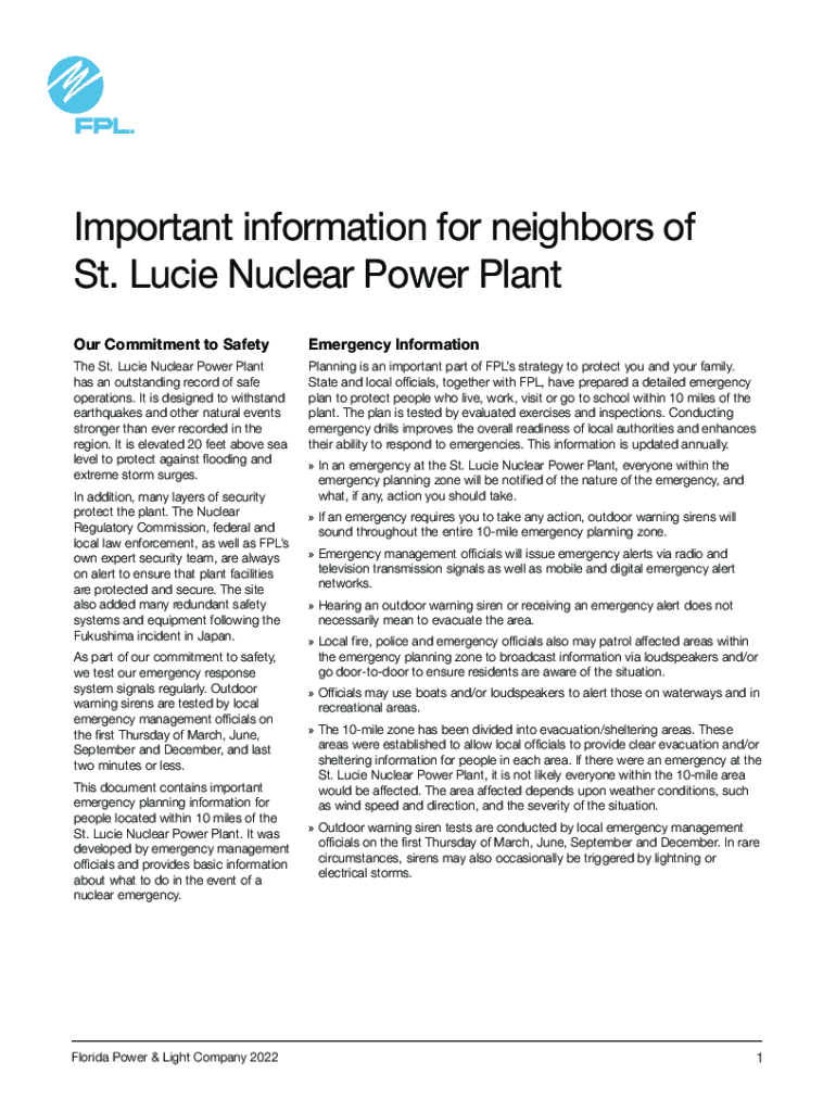 Important information for neighbors of St. Lucie Nuclear Power Plant Our Commitment to SafetyEmergency Information St. Lucie Nuclear Power Plant has an outstanding record of safe operations. It is
