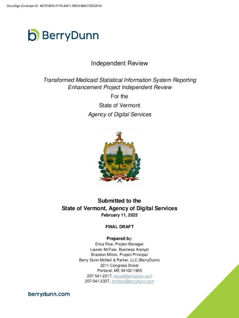DocuSign Envelope ID: 4EF81B05FF9344F189D98B4376252F55Independent Review Transformed Medicaid Statistical Information System Reporting Enhancement Project Independent Review For the State of Vermont