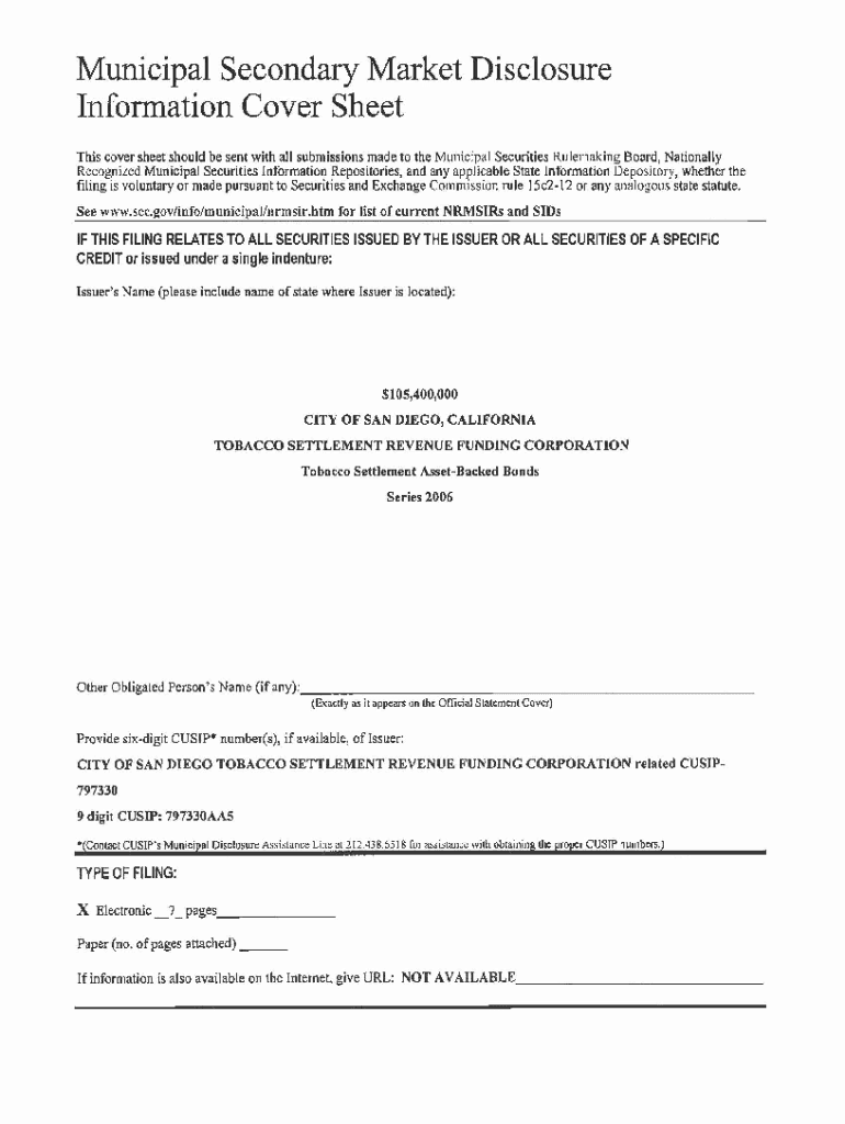 Municipal Secondary Market Disclosure Information Cover Sheet This cover sheet should be sent with all submissions made to the Municipal Securities Rule making Board, Nationally Recognized Municipal