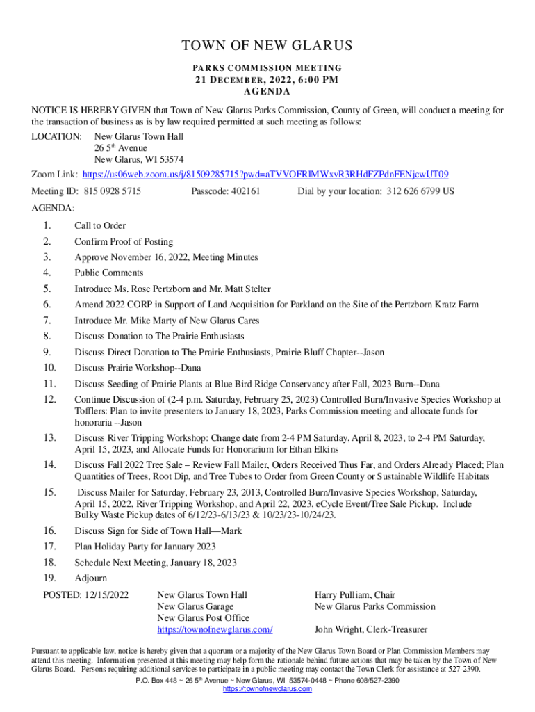 TOWN OF NEW GLARES PA R KS C OM M I S S I ON M E E T I N G21 D E C E M B E R, 2022, 6:00 PM AGENDA NOTICE IS HEREBY GIVEN that Town of New Glares Parks Commission, County of Green, will conduct a