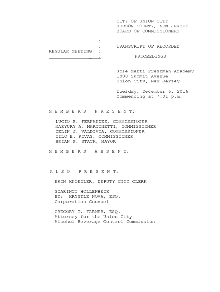CITY OF UNION CITY HUDSON COUNTY, NEW JERSEY BOARD OF COMMISSIONERSREGULAR MEETING _: : : :TRANSCRIPT OF RECORDED PROCEEDINGS José Martí Freshman Academy 1800 Summit Avenue Union City, New Jersey