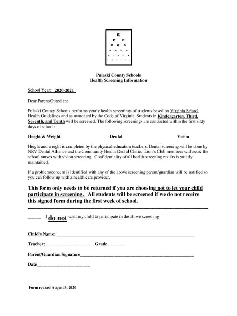 Pulaski County Schools Health Screening Information School Year: _20202021_ Dear Parent/Guardian: Pulaski County Schools performs yearly health screenings of students based on Virginia School Health