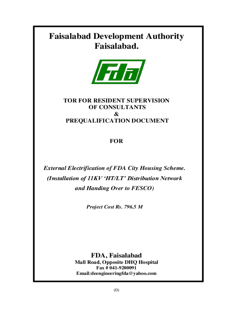 Faisalabad Development Authority Faisalabad. TOR FOR RESIDENT SUPERVISION OF CONSULTANTS & PREQUALIFICATION DOCUMENTFORExternal Electrification of FDA City Housing Scheme. (Installation of 11KV HT/LT