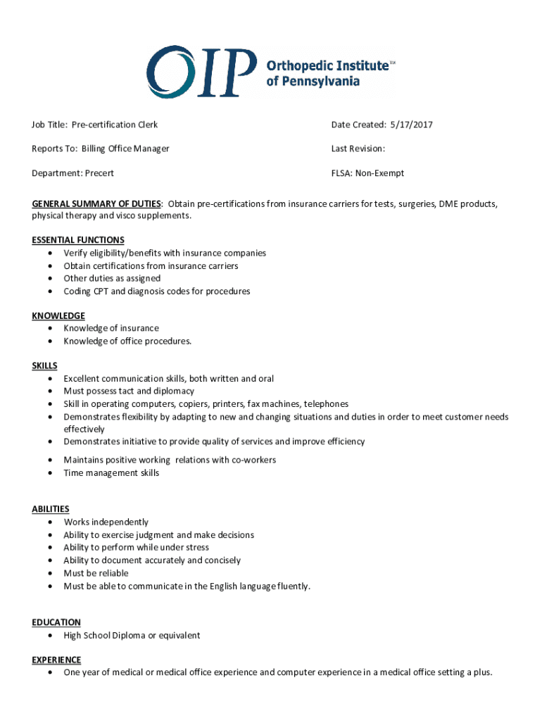 Get the free Obtain pre-certifications from insurance carriers for tests, ...