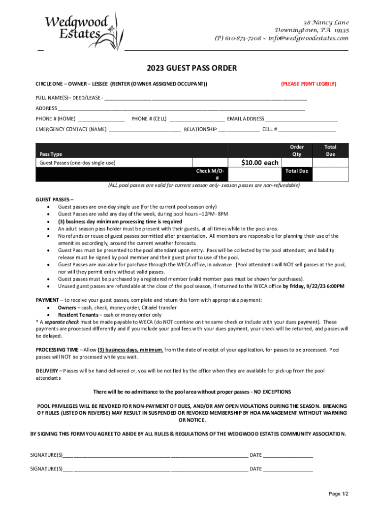 38 Nancy Lane Downingtown, PA 19335 (P) 6108737208 info@wedgwoodestates.com___2023 GUEST PASS ORDER CIRCLE ONE OWNER LESSEE (RENTER (OWNER ASSIGNED OCCUPANT))(PLEASE PRINT LEGIBLY)FULL NAME(S) DEED/LEASE