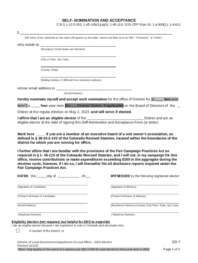 SELF NOMINATION AND ACCEPTANCE C.R.S 113.5303; 145109(1)(a)(II); 145110; SOS CPF Rule 16; 14908(1); 14912I, (full name of the candidate as the name will appear on the ballot, cannot use titles such