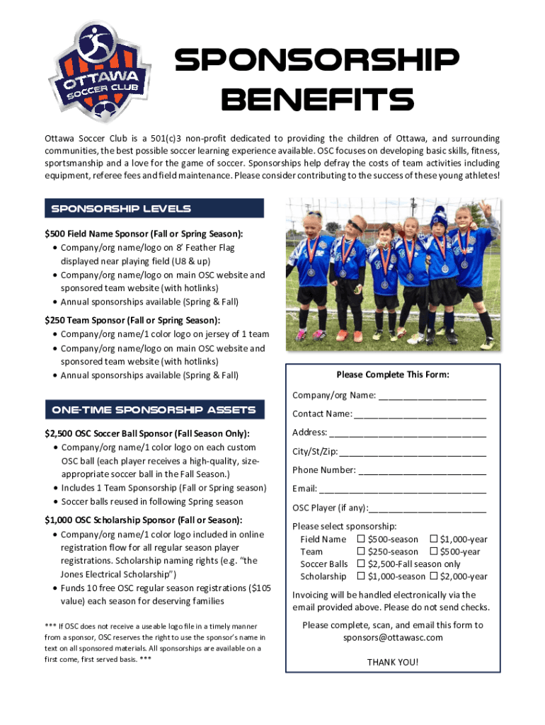 Sponsorship BENEFITS Ottawa Soccer Club is a 501(c)3 nonprofit dedicated to providing the children of Ottawa, and surrounding communities, the best possible soccer learning experience available. OSC