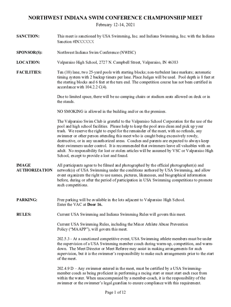 NORTHWEST INDIANA SWIM CONFERENCE CHAMPIONSHIP MEET February 1214, 2021 SANCTION:This meet is sanctioned by USA Swimming, Inc. and Indiana Swimming, Inc. with the Indiana Sanction #INXXXXXSPONSOR(S):Northwest