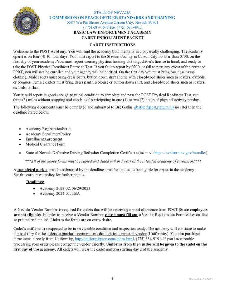 STATE OF NEVADA COMMISSION ON PEACE OFFICER STANDARDS AND TRAINING 5587 Wei Pie Shone Avenue Carson City, Nevada 89701 (775) 6877678 Fax (775) 6874911 BASIC LAW ENFORCEMENT ACADEMY CADET ENROLLMENT