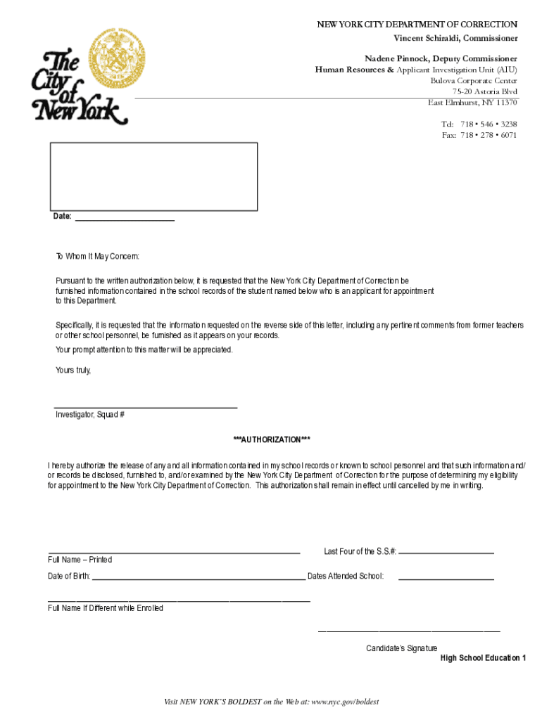 NEW YORK CITY DEPARTMENT OF CORRECTION Vincent Chiral, Commissioner Nadine Bannock, Deputy Commissioner Human Resources & Applicant Investigation Unit (AIU) Vulva Corporate Center 7520 Astoria Blvd
