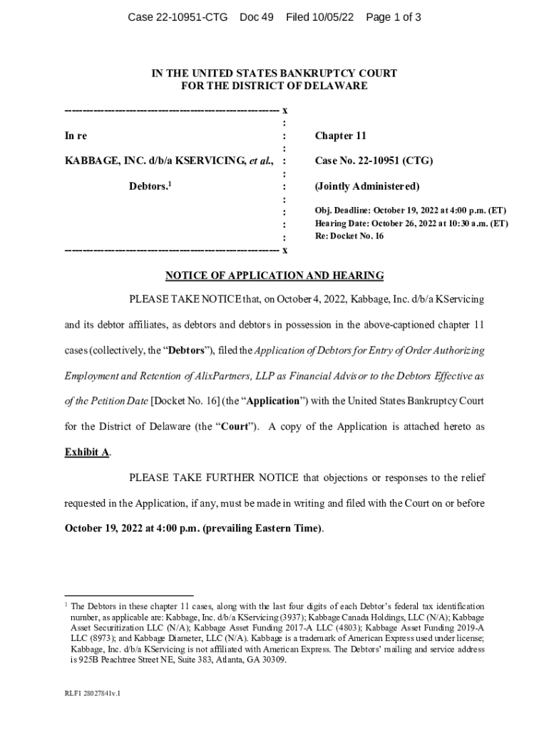 Case 2210951CTGDoc 49Filed 10/05/22Page 1 of 3IN THE UNITED STATES BANKRUPTCY COURT FOR THE DISTRICT OF DELAWARE x : In re : : CABBAGE, INC. d/b/a SERVICING, et al., : : 1 Debtors. : : : : : chapter
