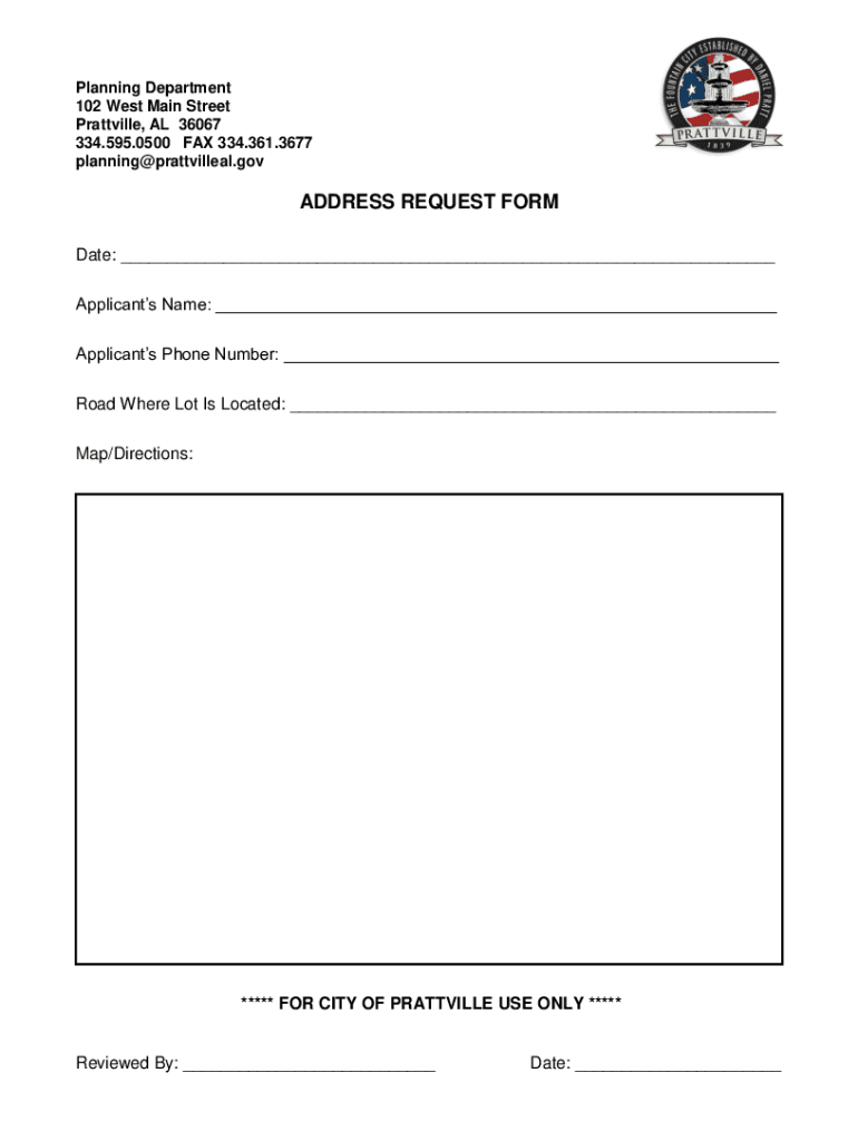 Planning Department 102 West Main Street Prattville, AL 36067 334.595.0500 FAX 334.361.3677 planning@prattvilleal.govADDRESS REQUEST FORM Date: ___ Applicants Name: ___ Applicants Phone Number: ___