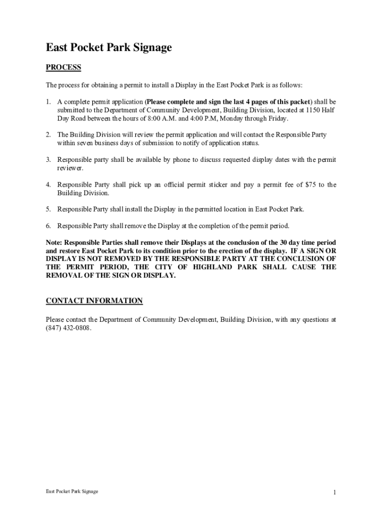 East Pocket Park Signage PROCESS The process for obtaining a permit to install a Display in the East Pocket Park is as follows: 1. A complete permit application (Please complete and sign the last