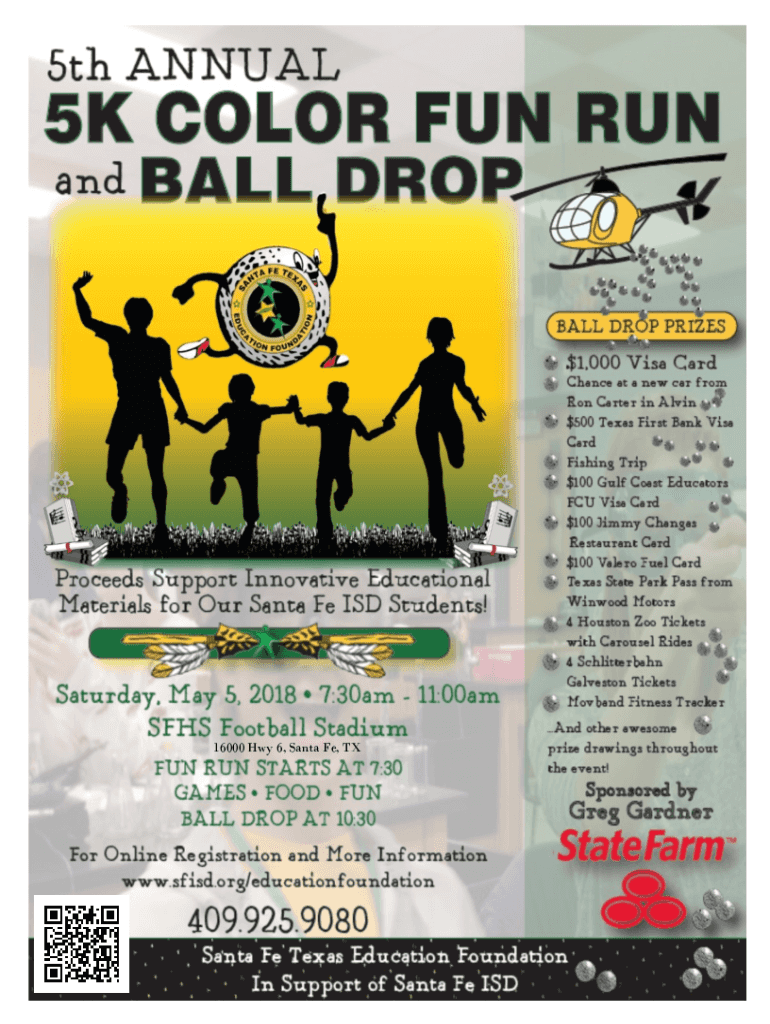 16000 Hwy 6, Santa Fe, Register for the Fun Run and /or Ball Drop Proceeds benefit SF ISD students! You do not need to be present to win the ball drop prizes. You can also register and pay online