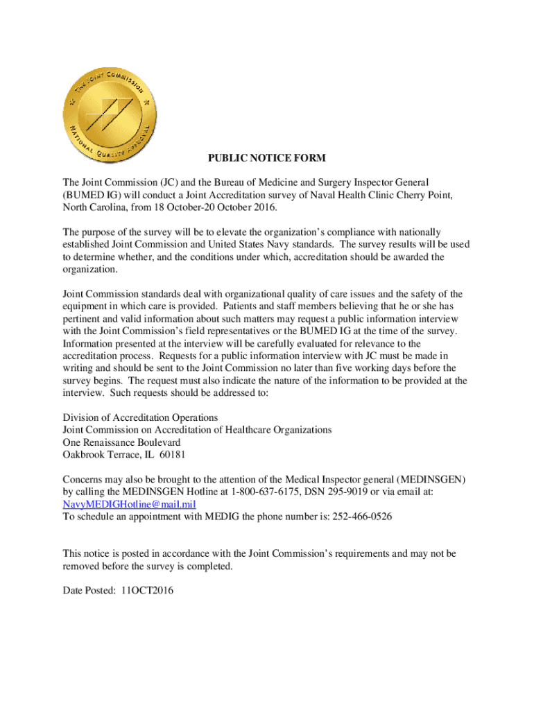 PUBLIC NOTICE FORM The Joint Commission (JC) and the Bureau of Medicine and Surgery Inspector General (BUMPED IG) will conduct a Joint Accreditation survey of Naval Health Clinic Cherry Point, North
