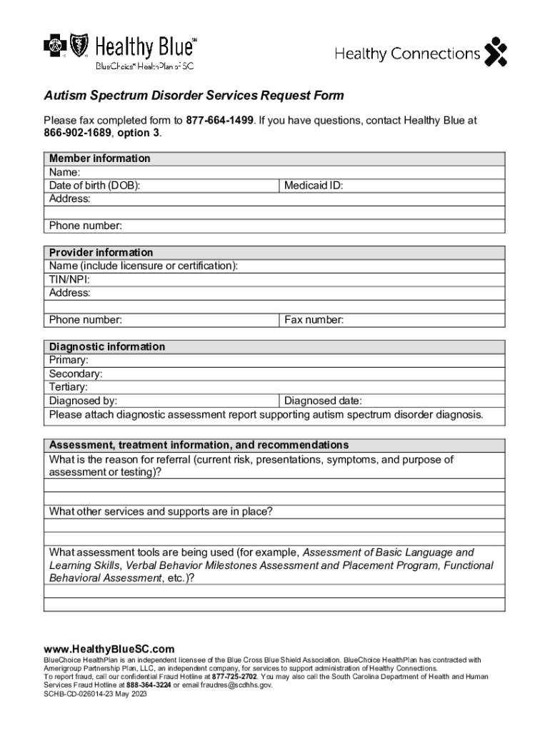 Autism Spectrum Disorder Services Request Form Please fax completed form to 8776641499. If you have questions, contact Healthy Blue at 8669021689, option 3. Member information Name: Date of birth