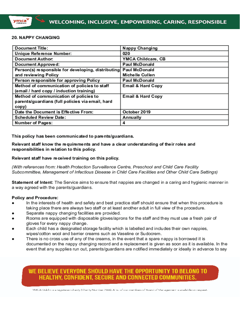 20. NAPPY CHANGING Document Title: Unique Reference Number: Document Author: Document Approved: Person(s) responsible for developing, distributing and reviewing Policy Person responsible for approving