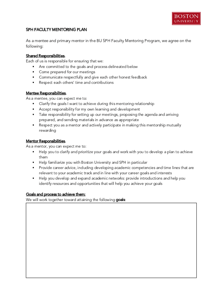 SPH FACULTY MENTORING PLAN As a mentee and primary mentor in the BU SPH Faculty Mentoring Program, we agree on the following: Shared Responsibilities. Each of us is responsible for ensuring that we: