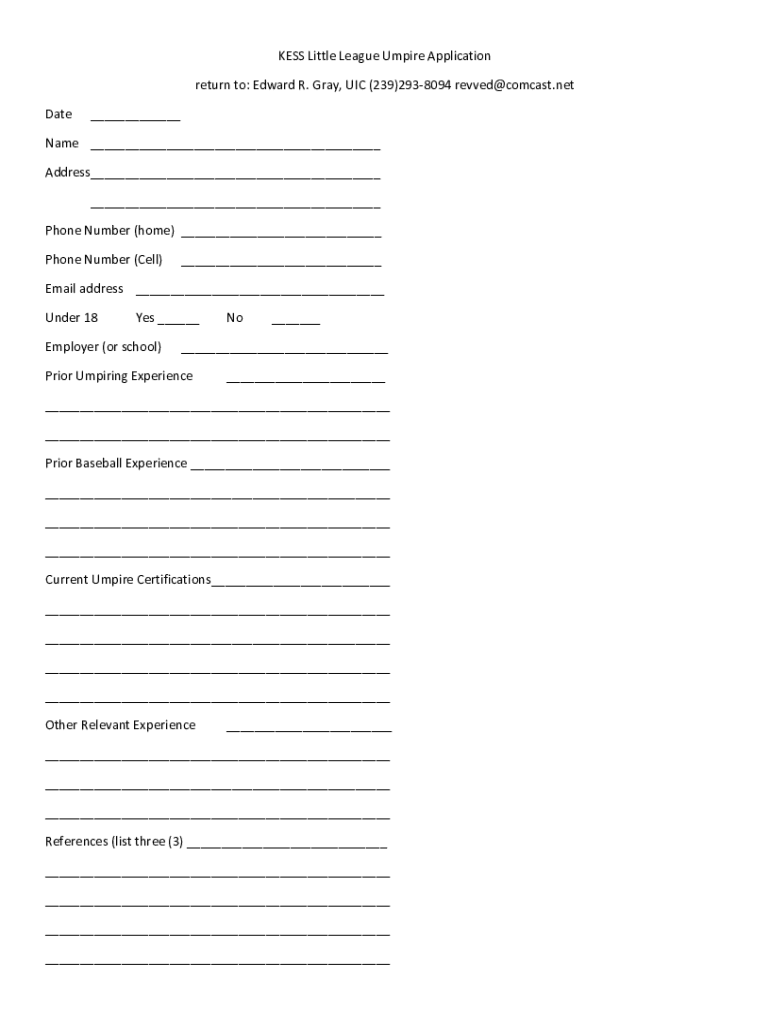 LESS Little League Umpire Application return to: Edward R. Gray, UIC (239)2938094 revved@comcast.net Date___Name ___ Address___ ___ Phone Number (home) ___ Phone Number (Cell)___Email address ___
