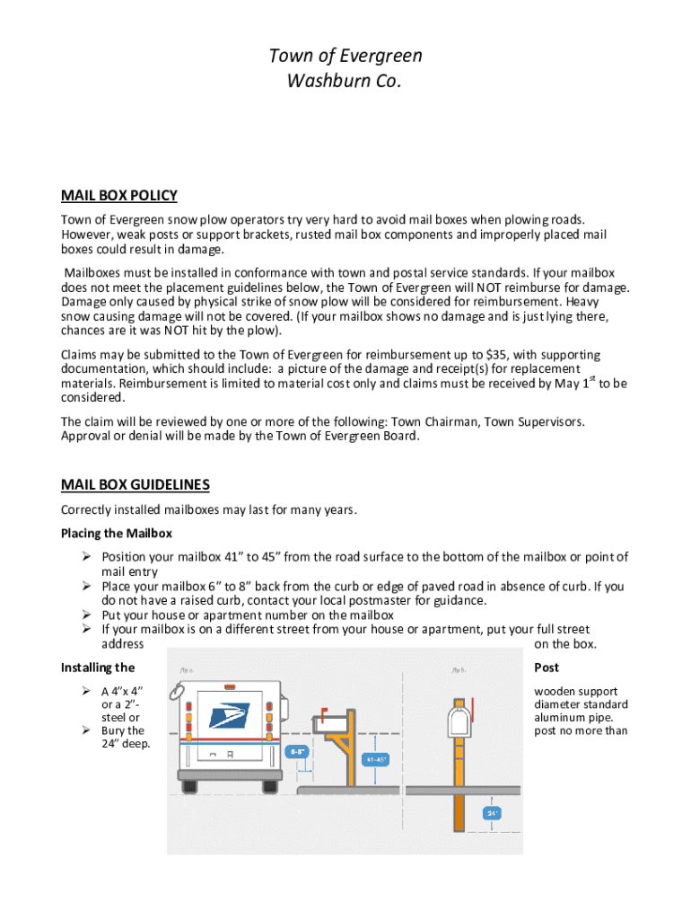 Town of Evergreen Washburn Co. Mailbox POLICY Town of Evergreen snow plow operators try very hard to avoid mail boxes when plowing roads. However, weak posts or support brackets, rusted mailbox components