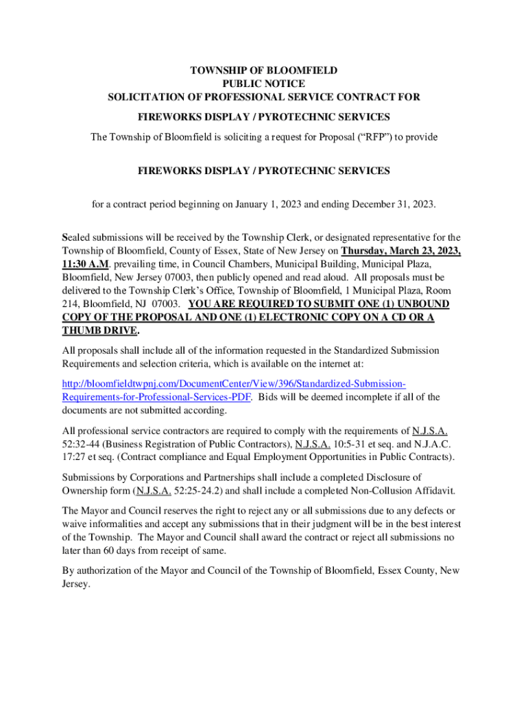 TOWNSHIP OF BLOOMFIELD PUBLIC NOTICE SOLICITATION OF PROFESSIONAL SERVICE CONTRACT FOR FIREWORKS DISPLAY / PYROTECHNIC SERVICES The Township of Bloomfield is soliciting a request for Proposal (RFP)