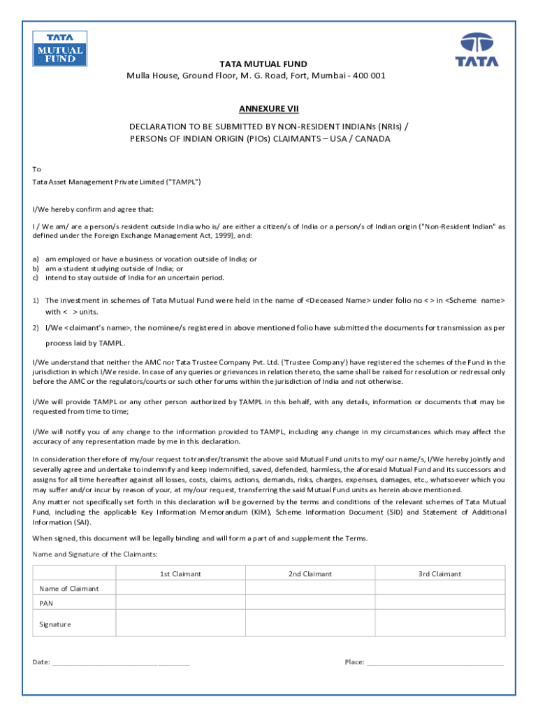TATA MUTUAL FUND Mull House, First Floor, M. G. Road, Fort, Mumbai 400 001ANNEXURE VII DECLARATION TO BE SUBMITTED BY NONRESIDENT Indians (Iris) / Persons OF INDIAN ORIGIN (PIO's) CLAIMANTS USA /