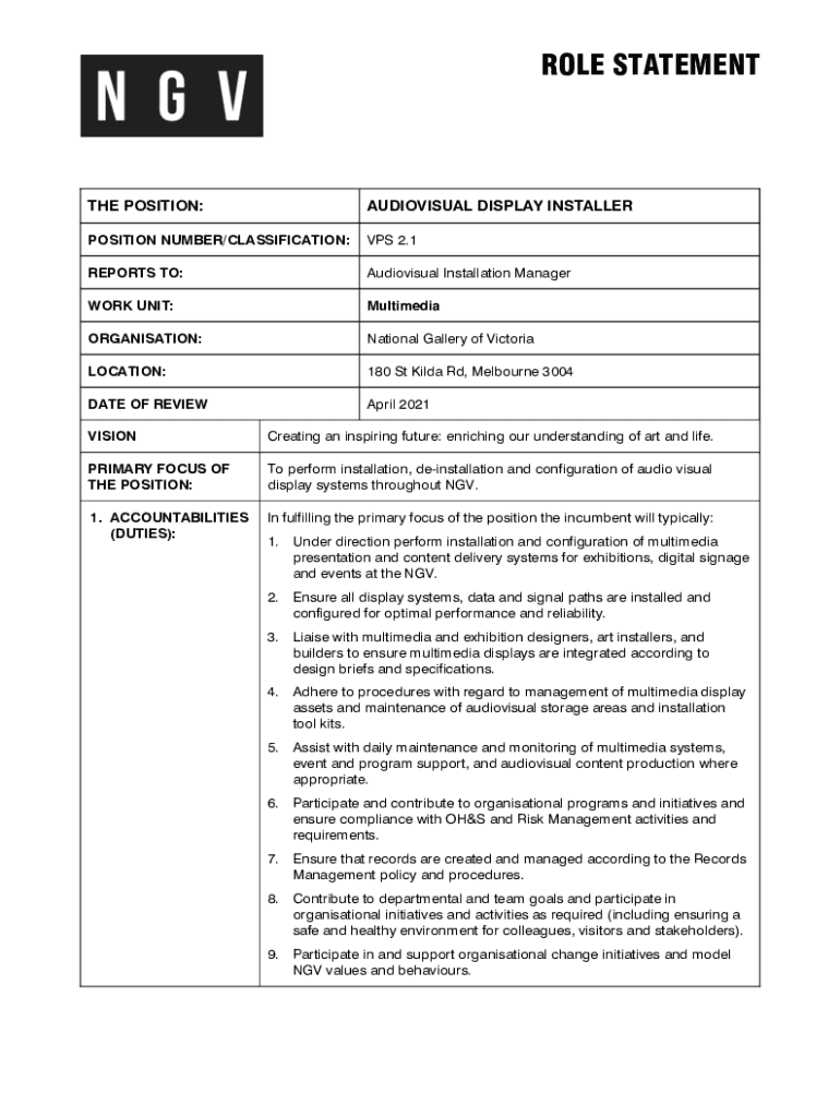 Get the free Audiovisual Display Installer (Casual Positions). Role Statement Template