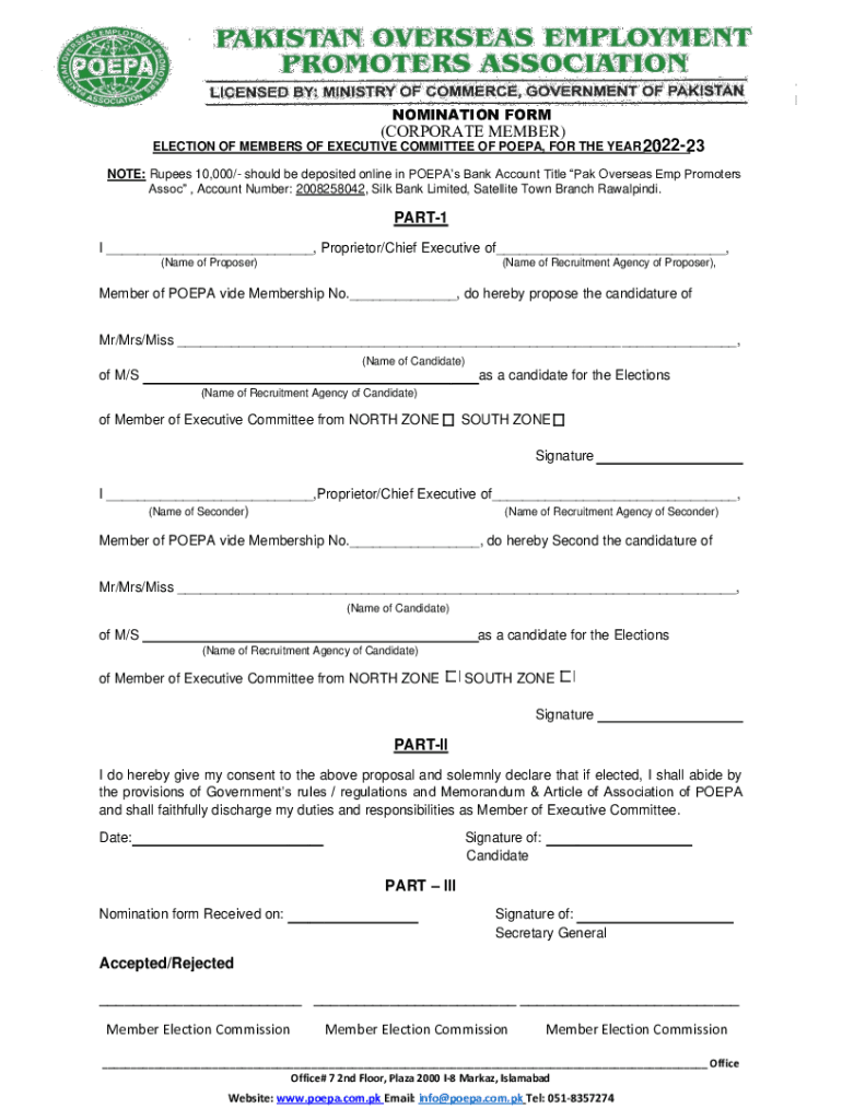 NOMINATION FORM(CORPORATE MEMBER)ELECTION OF MEMBERS OF EXECUTIVE COMMITTEE OF POPPA, FOR THE YEAR 2022202021 23 NOTE: Rupees 10,000/ should be deposited online in Poppas Bank Account Title PAK Overseas