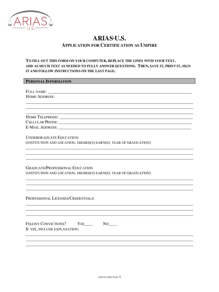 ARIAS. S. APPLICATION FOR CERTIFICATION AS UMPIRE TO FILL OUT THIS FORM ON YOUR COMPUTER, REPLACE THE LINES WITH YOUR TEXT. ADD AS MUCH TEXT AS NEEDED TO FULLY ANSWER QUESTIONS. THEN, SAVE IT, PRINT