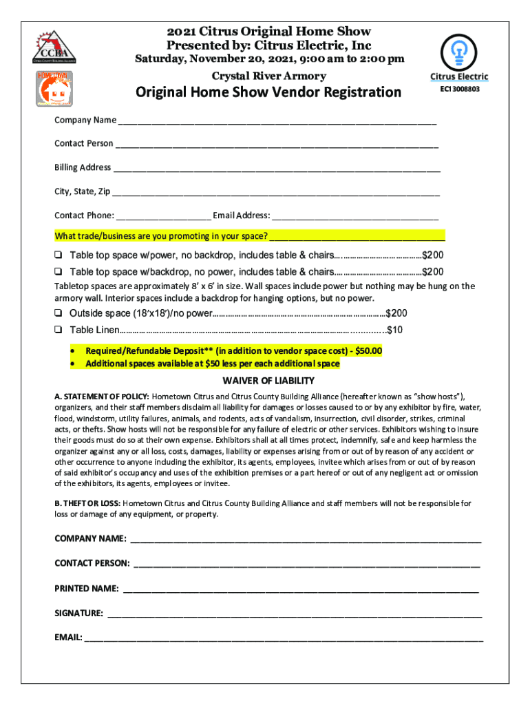 2021 Citrus Original Home Show Presented by: Citrus Electric, Inc Saturday, November 20, 2021, 9:00 am to 2:00 pm Crystal River ArmoryOriginal Home Show Vendor RegistrationEC13008803Company Name ___