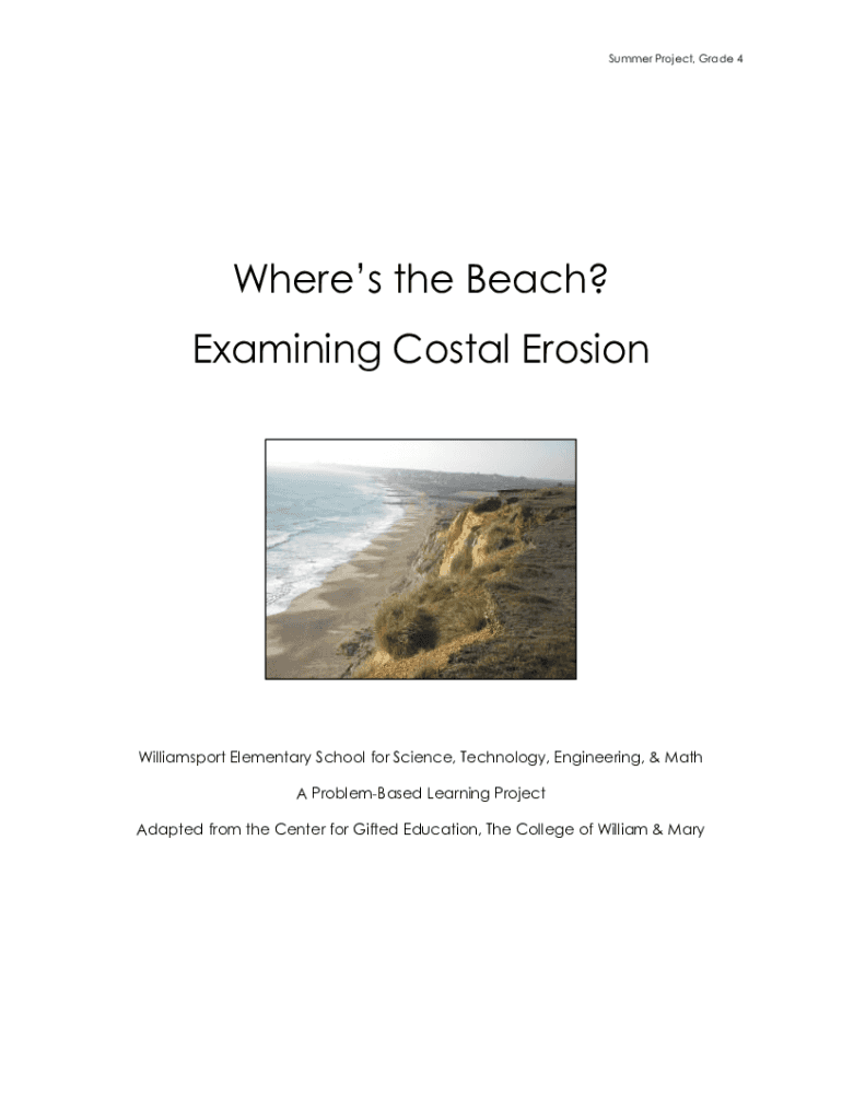 Summer Project, Grade 4Wheres the Beach? Examining Costal Erosion Williamsport Elementary School for Science, Technology, Engineering, & Math A ProblemBased Learning Project Adapted from the Center