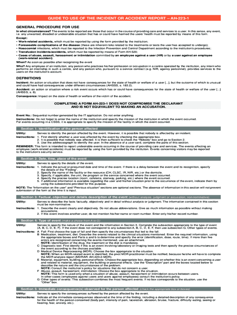 GUIDE TO USE OF THE INCIDENT OR ACCIDENT REPORT AH2231 GENERAL PROCEDURE FOR USE In what circumstances? The events to be reported are those that occur in the course of providing care and services