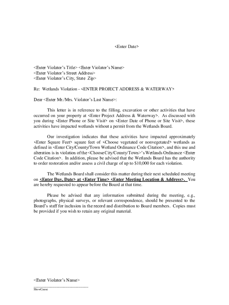 Enter Patienter Violators Title Enter Violators Name Enter Violators Street Address Enter Violators City, State Zip Re: Wetlands Violation ENTER PROJECT ADDRESS & WATERWAY Dear Enter Mr./Mrs. Violators
