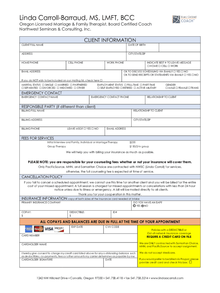 Linda CarrollBarraud, MS, LEFT, BCC Oregon Licensed Marriage & Family Therapist, Board Certified Coach Northwest Seminars & Consulting, Inc. CLIENT INFORMATIONCLIENT FULL NAMED ATE OF BIRTHADDRESSCITY/STATE/iPhone