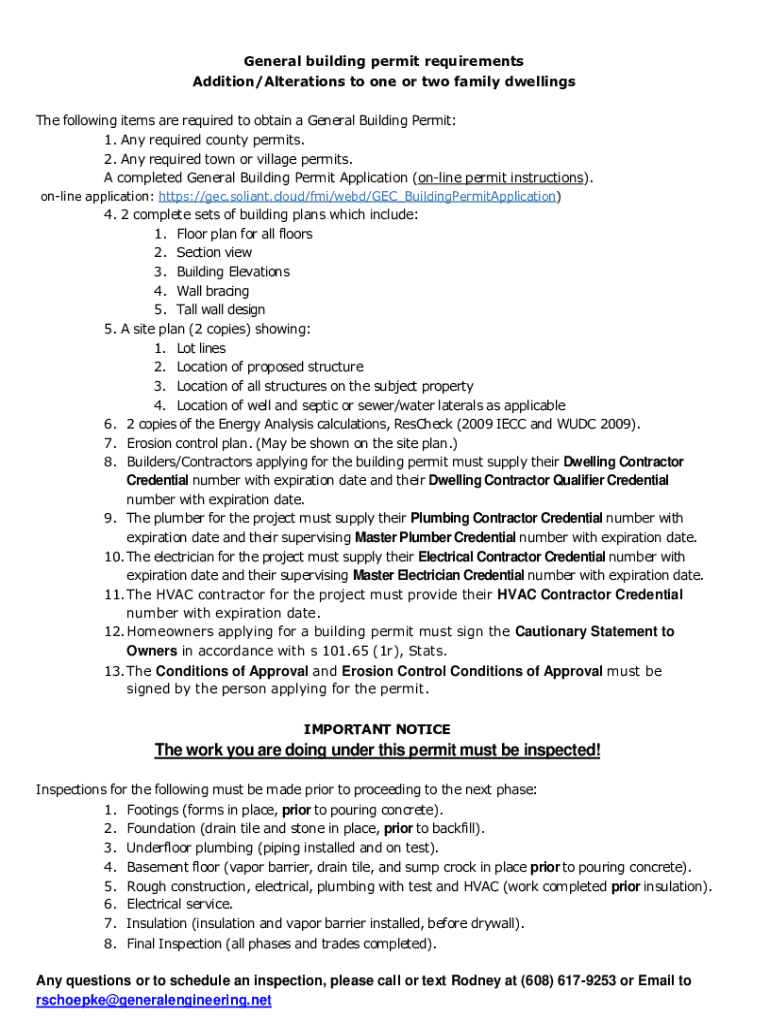 General building permit requirements Addition/Alterations to one or two family dwellings The following items are required to obtain a General Building Permit: 1. Any required county permits. 2. Any