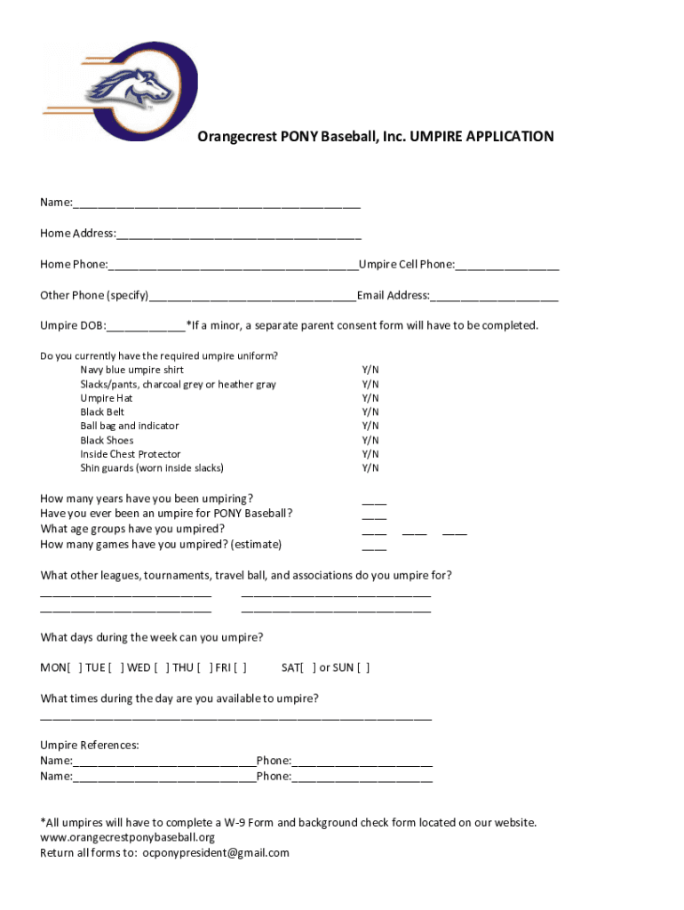 Orange crest PONY Baseball, Inc. UMPIRE APPLICATIONName:___ Home Address:___ Home Phone:___Umpire Cell Phone:___ Other Phone (specify)___Email Address:___ Umpire DOB:___*If a minor, a separate parent