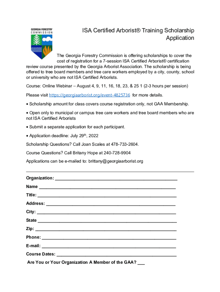 ISA Certified Arborist Training Scholarship Application The Georgia Forestry Commission is offering scholarships to cover the cost of registration for a 7session ISA Certified Arborist certification