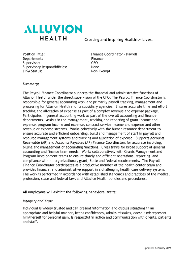 Creating and Inspiring Healthier Lives. Position Title: Department: Supervisor: Supervisory Responsibilities: FLEA Status:Finance Coordinator Payroll Finance CFO None NonExemptSummary: The Payroll