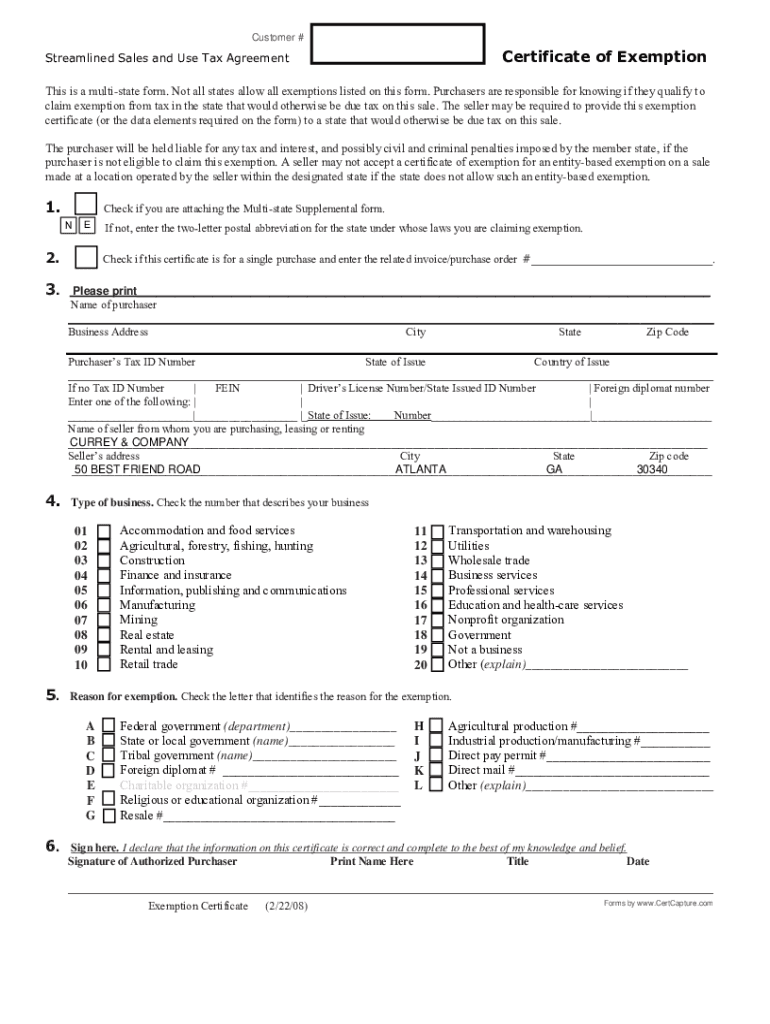 Customer #Certificate of ExemptionStreamlined Sales and Use Tax Agreements is a multistate form. Not all states allow all exemptions listed on this form. Purchasers are responsible for knowing if