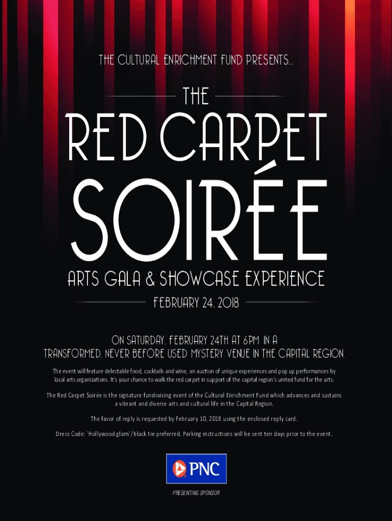 THE CULTURAL ENRICHMENT FUND PRESENTS...THERE'D CARPET ARTS GALA & SHOWCASE EXPERIENCE FEBRUARY 24, 2018, ON SATURDAY, FEBRUARY 24TH AT 6PM IN A TRANSFORMED, NEVER BEFORE USED MYSTERY VENUE IN THE